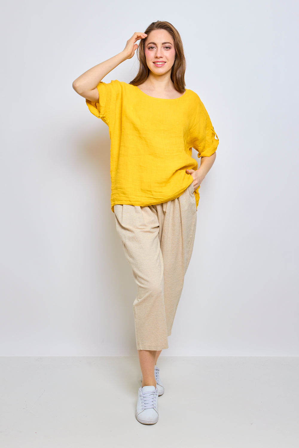 Ajoutez une touche de sophistication décontractée à votre garde-robe avec notre top en lin. Avec une coupe ajustée flatteuse et des manches courtes, ce top est à la fois élégant et confortable.