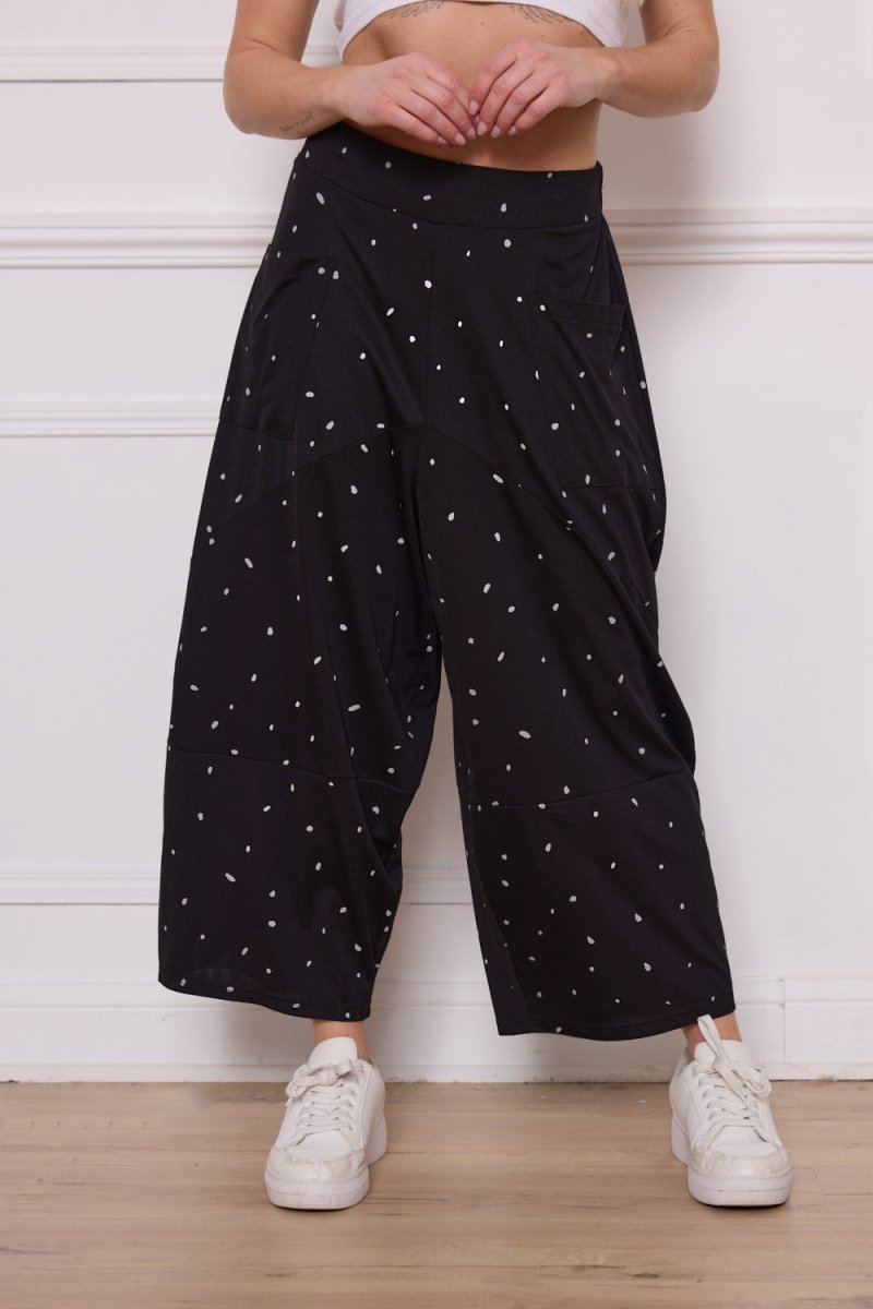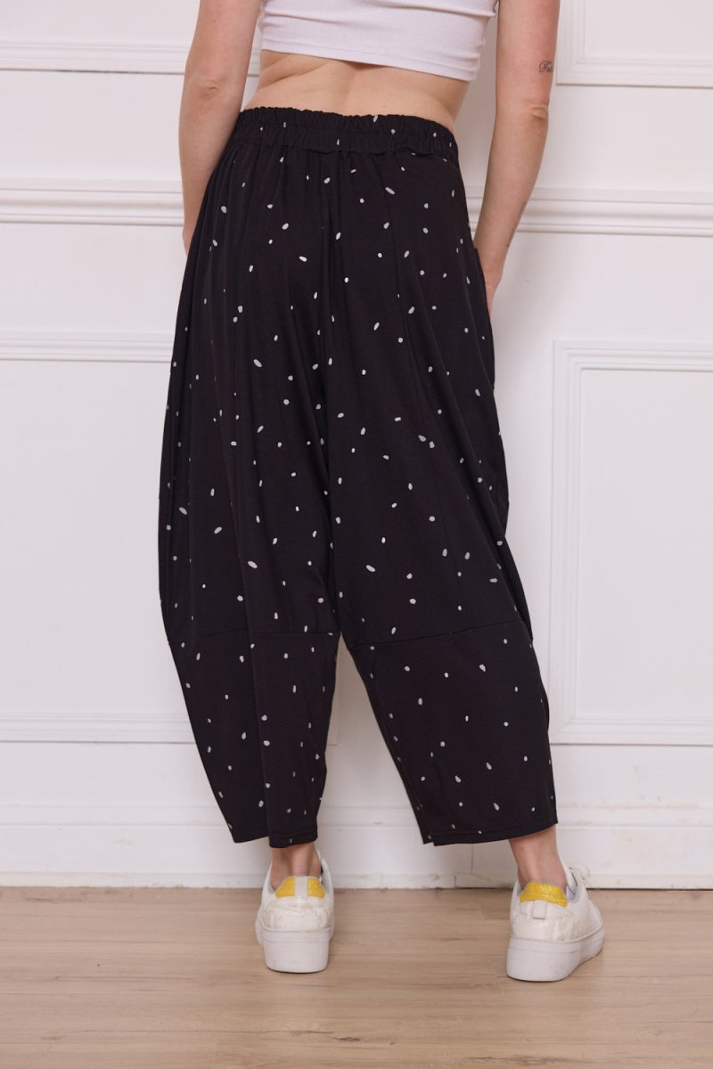 Osez l'originalité avec notre pantalon noir à motifs grande taille, conçu pour mettre en valeur vos jambes avec style et caractère. Sa base noire intemporelle sublimée de motifs tendance apporte une dimension unique à votre garde-robe tandis que sa coupe flatteuse galbe votre silhouette avec douceur, pour un look aussi élégant que confortable.