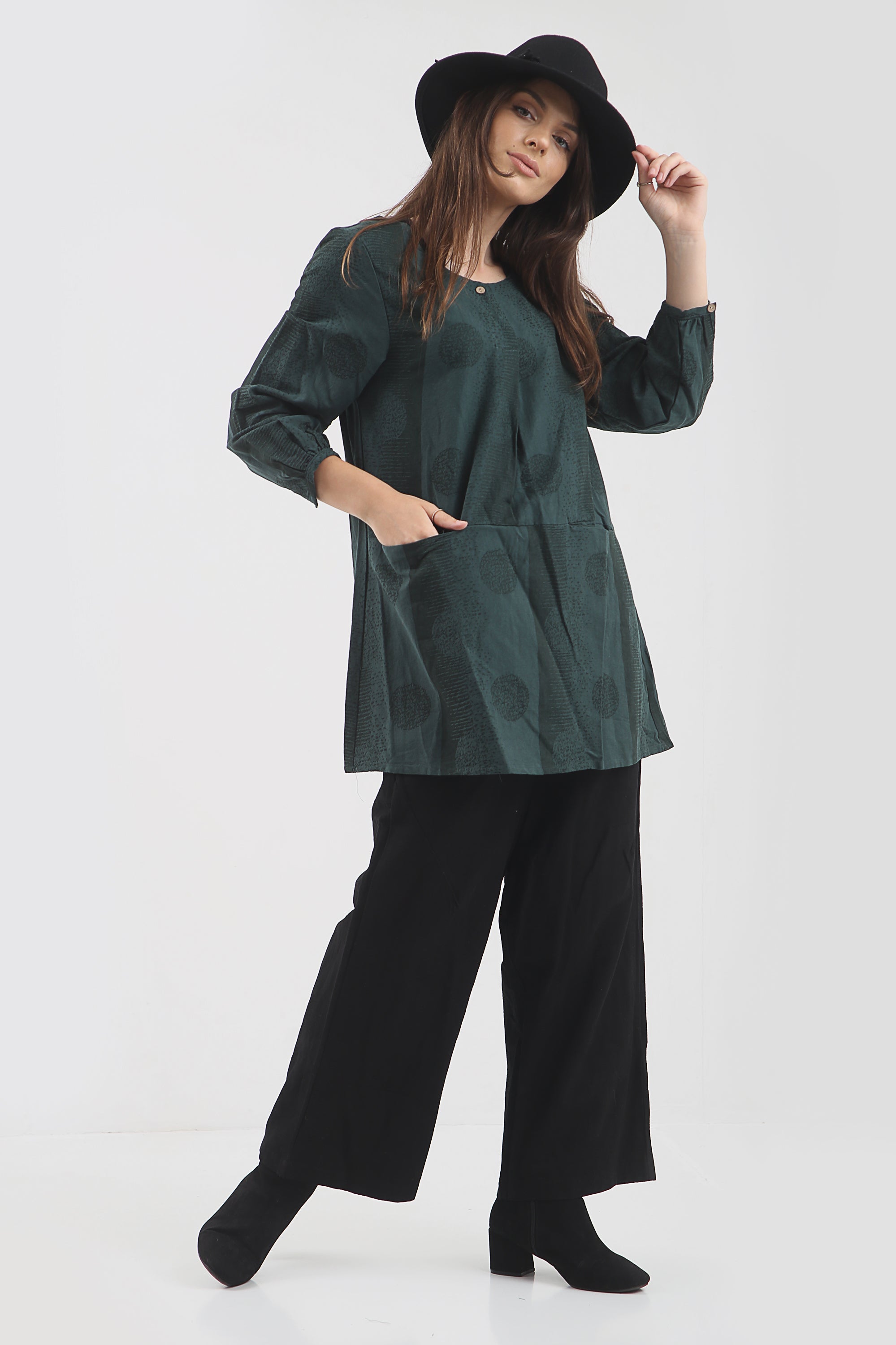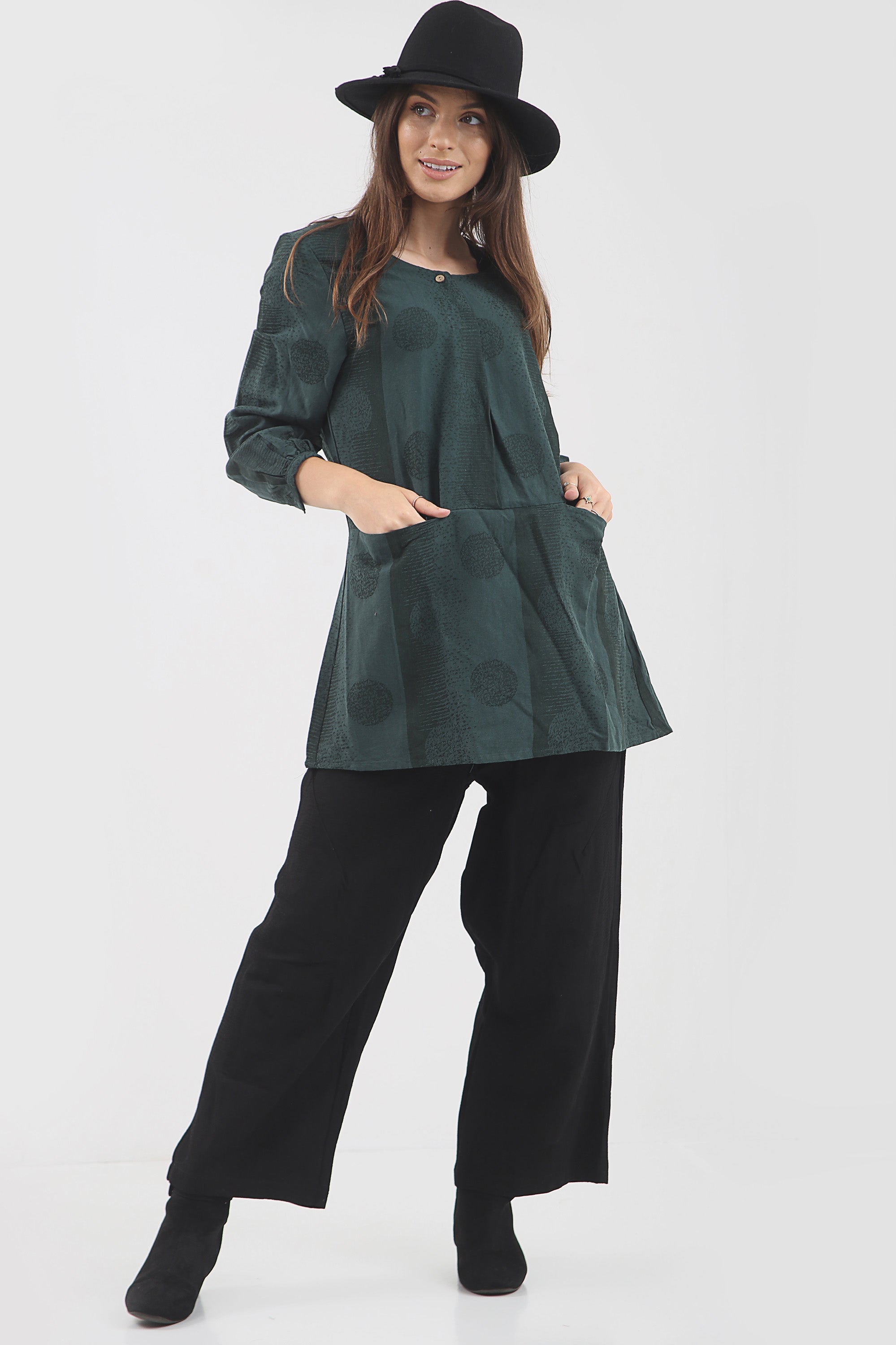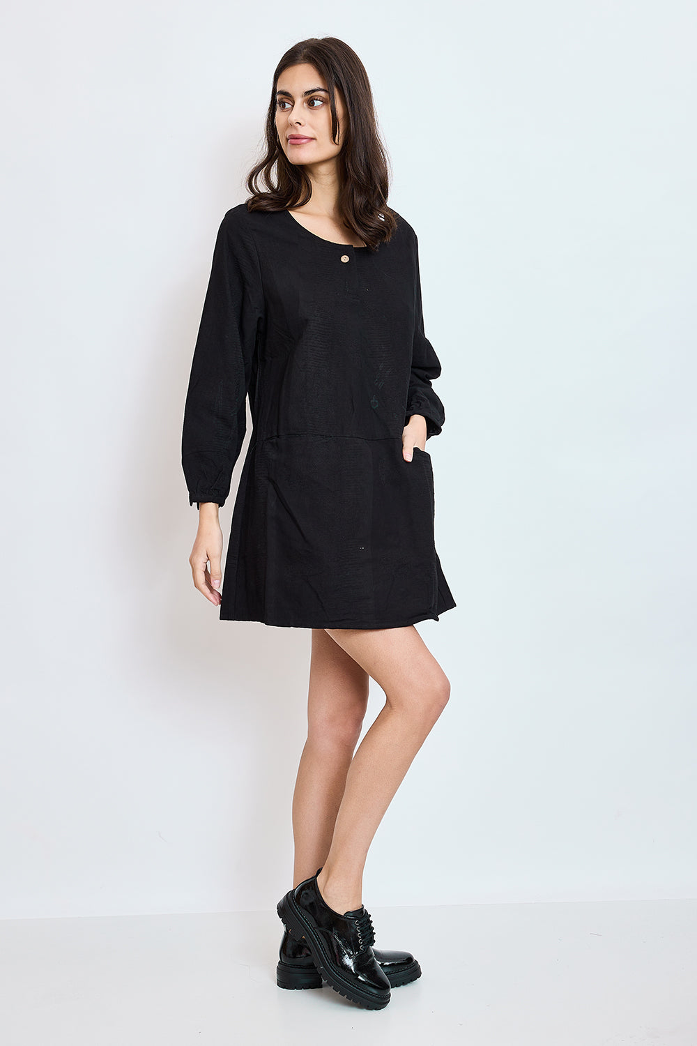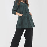 Dieses Tunikakleid ist perfekt für die kalten Wintermonate. Es hat zwei Seitentaschen und einen schönen coolen Aufdruck, damit Sie stilvoll und warm bleiben.